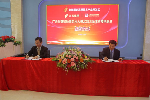 3月28日上午,在北部灣海洋科技創(chuàng)新港招商中心,舉行廣西萬益律師事務(wù)所入駐北部灣海洋科技創(chuàng)新港的簽約儀式。廣西正五集團(tuán)董事長(zhǎng)黃禮雄、副總裁榮培彥,廣西萬益律師事務(wù)所主任王瑩文、所管委會(huì)主任凌斌、執(zhí)行主任張海波等出席簽約儀式。